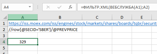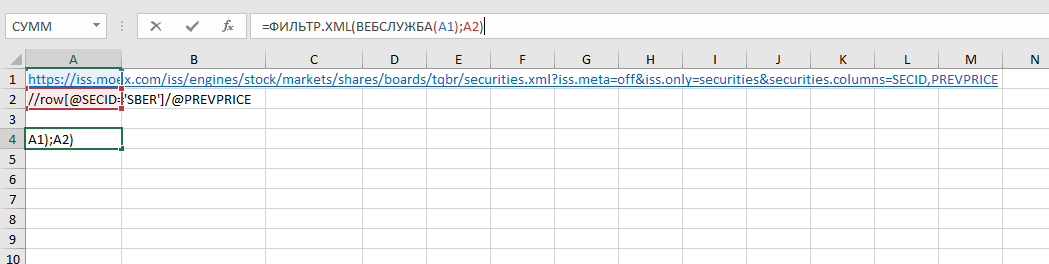 Пробуем выгрузить цену акций SBER с помощью связки функций ФИЛЬТР.XML + ВЕБСЛУЖБА.