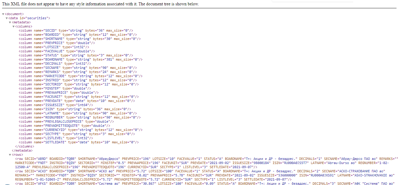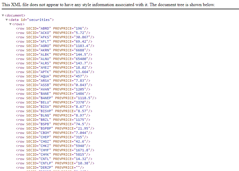 — отключить метаданные в заголовке. Они вам ни к чему. — рассматриваем только блок securities. — из всех данных забираем столбцы с тикером акции (SECID) и ценой (PREVPRICE).