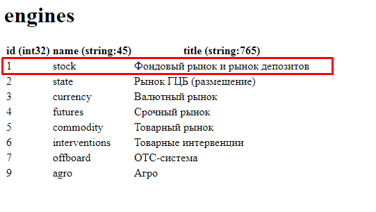 Как и в прошлый раз, сначала конструируем запрос к базе биржи. Перейдем на https://iss.moex.com/iss/engines.