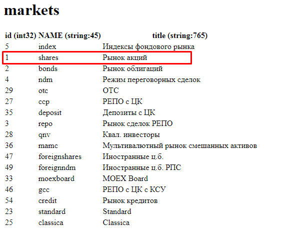 Нам интересен фондовый рынок — stock. В запрос добавляем в конце /stock/markets.