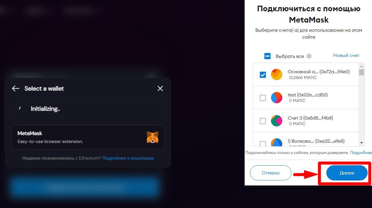 2.5. Подключаемся к кошельку и выбираем "MetaMask"