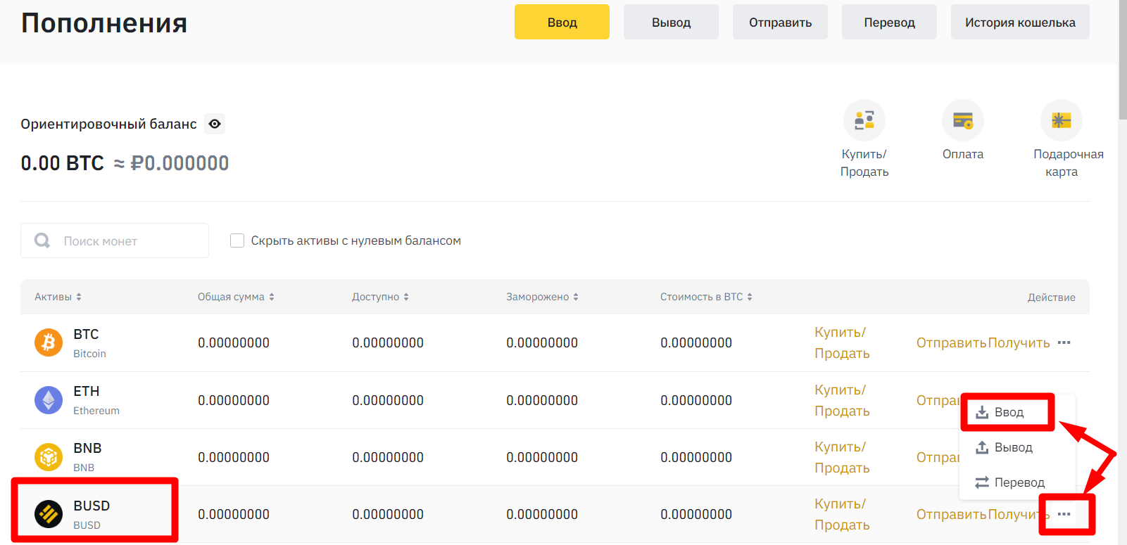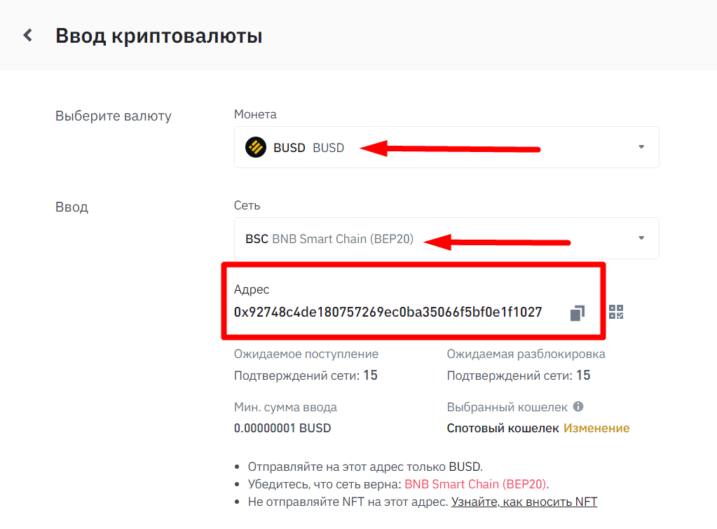 2.2.2 Выбираем нашу монету BUSD и сеть BSC BNB Smart Chain (BEP20) и пополняем кошелёк. Копируем адрес и отправляем с MetaMask BUSD