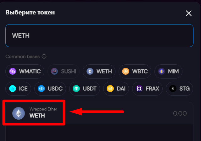 Далее нажмите «Выбрать токен», расположенный в нижнем поле, и выберите wETH из списка вариантов.