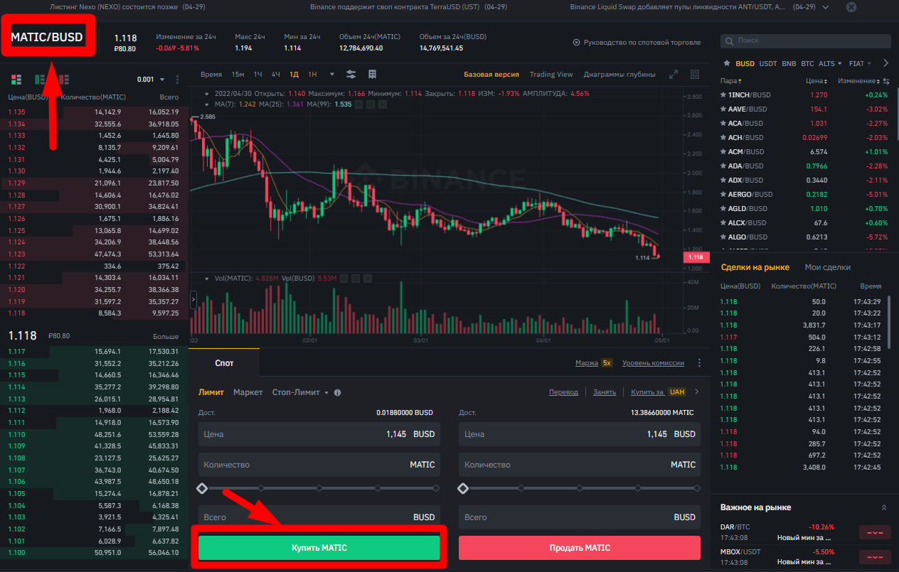 2.2. На Binance покупаем криптовалюту MATIC