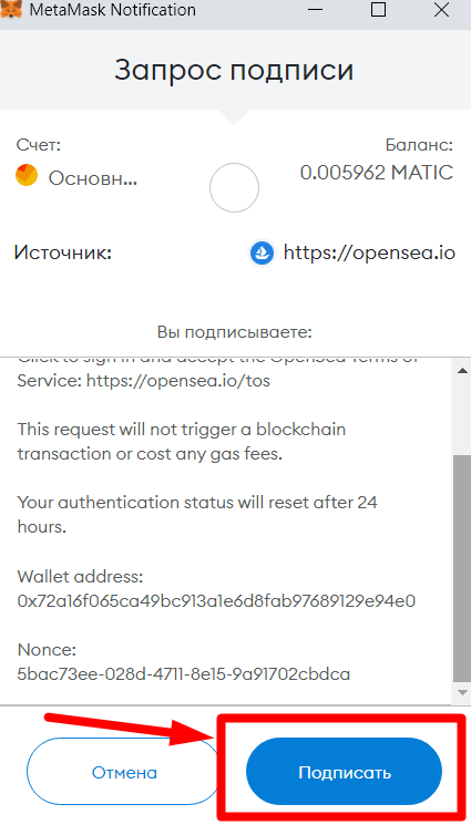 Далее появится всплывающее окно MetaMask, предлагающее пользователю подписать транзакцию.