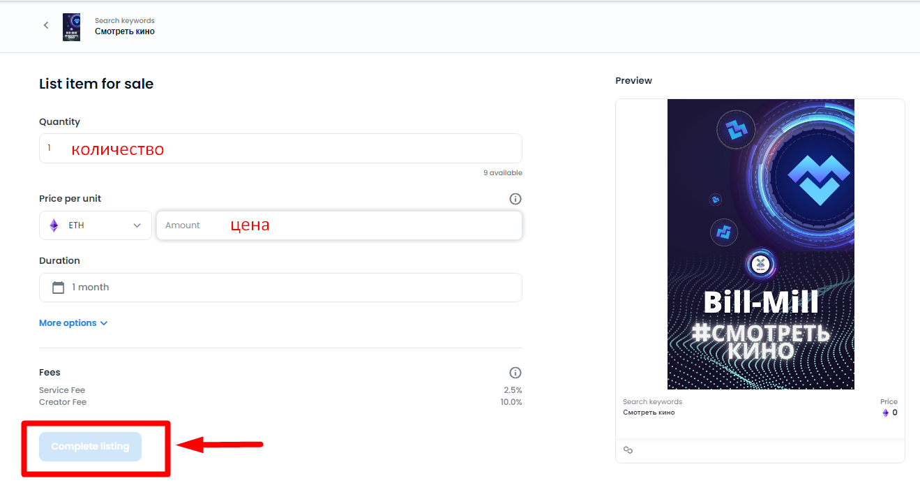 Заполняем поля: количество выставляемых на продажу NFT, цену и нажимаем кнопку Complete listing