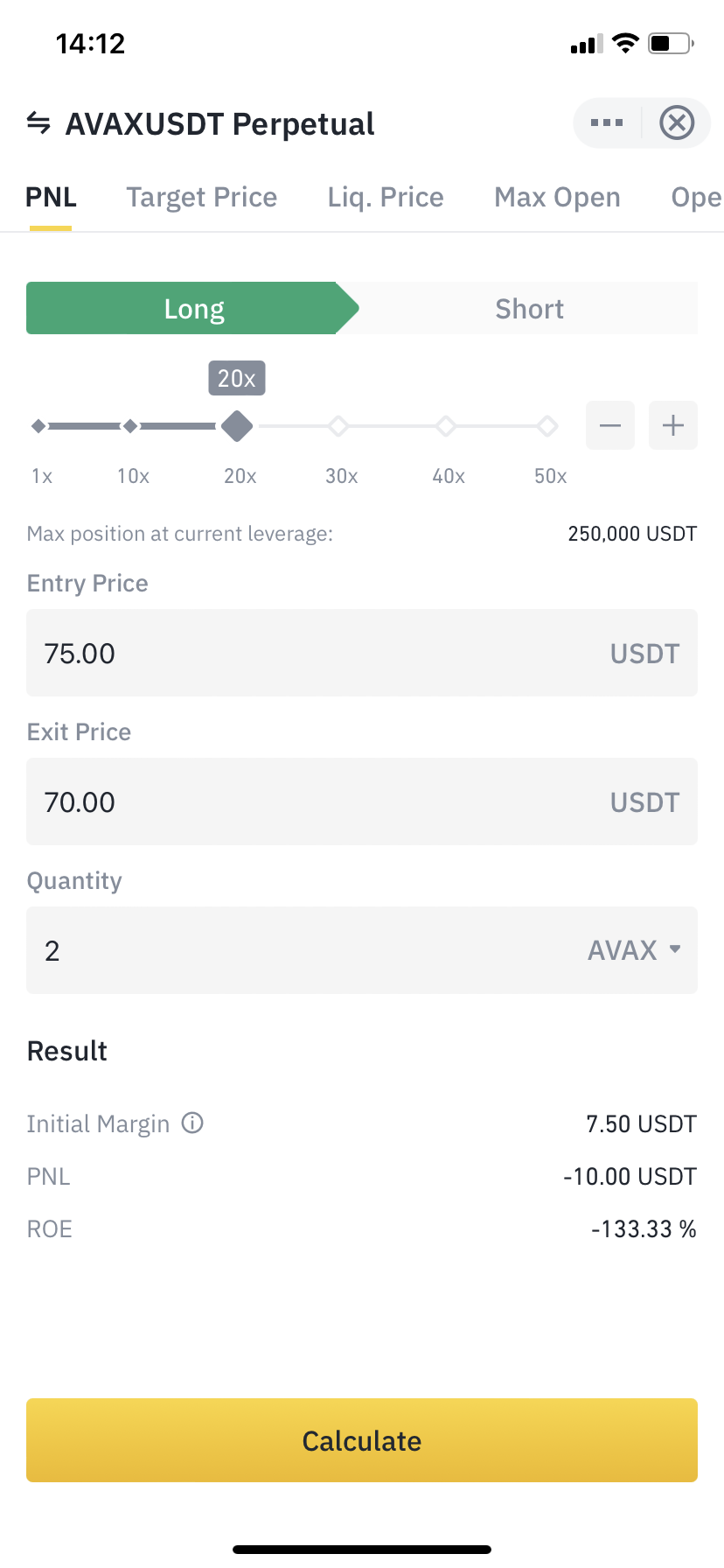 Выполняем пункты в такой же последовательности, вводим нашу точку входа, вводим цифру из нашего будущего стоп-лосса, в данном случае зашли по цене 75$, стоп-лосс ставим на 70$, вписываем, сколько токенов мы хотим купить (с учетом плеча), и нажимаем кнопку “Calculate”. И мы увидим, сколько $ мы можем потерять, если цена дойдёт до стоп-лосса.